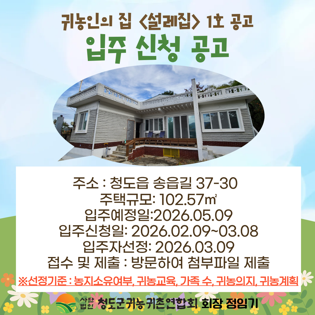 청도군 귀농인의 집 1호 입주 신청을 받고 있습니다.
