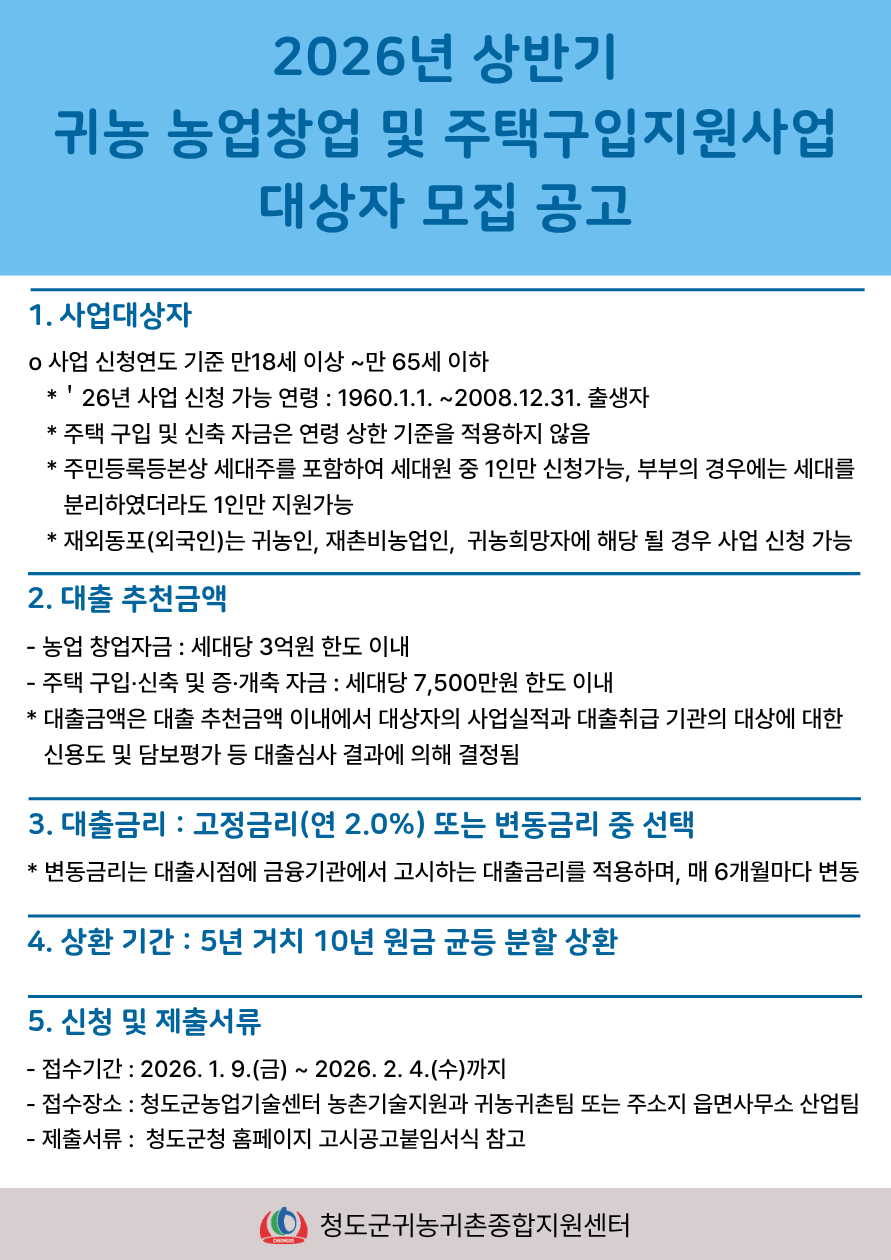 2026년 상반기 귀농 농업창업 및 주택구입지원사업 대상자 모집 공고